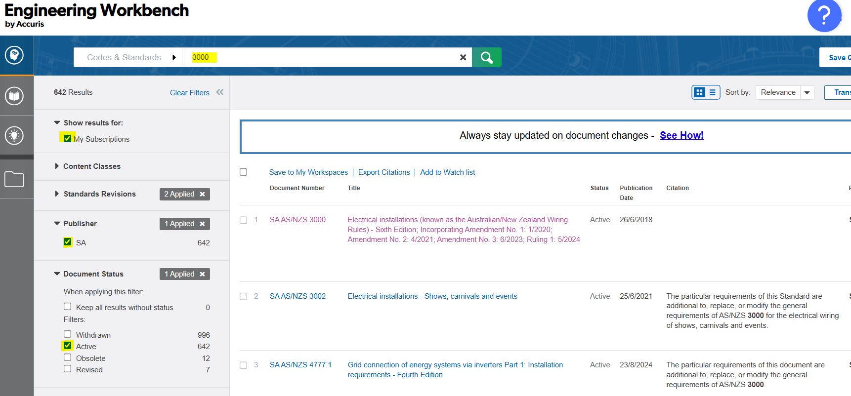 Type the standard number into the search box (prefix not needed), for example, 3000 and add Filters for My subscriptions, Publisher SA (Standards Australia) and Active - Then Refresh results