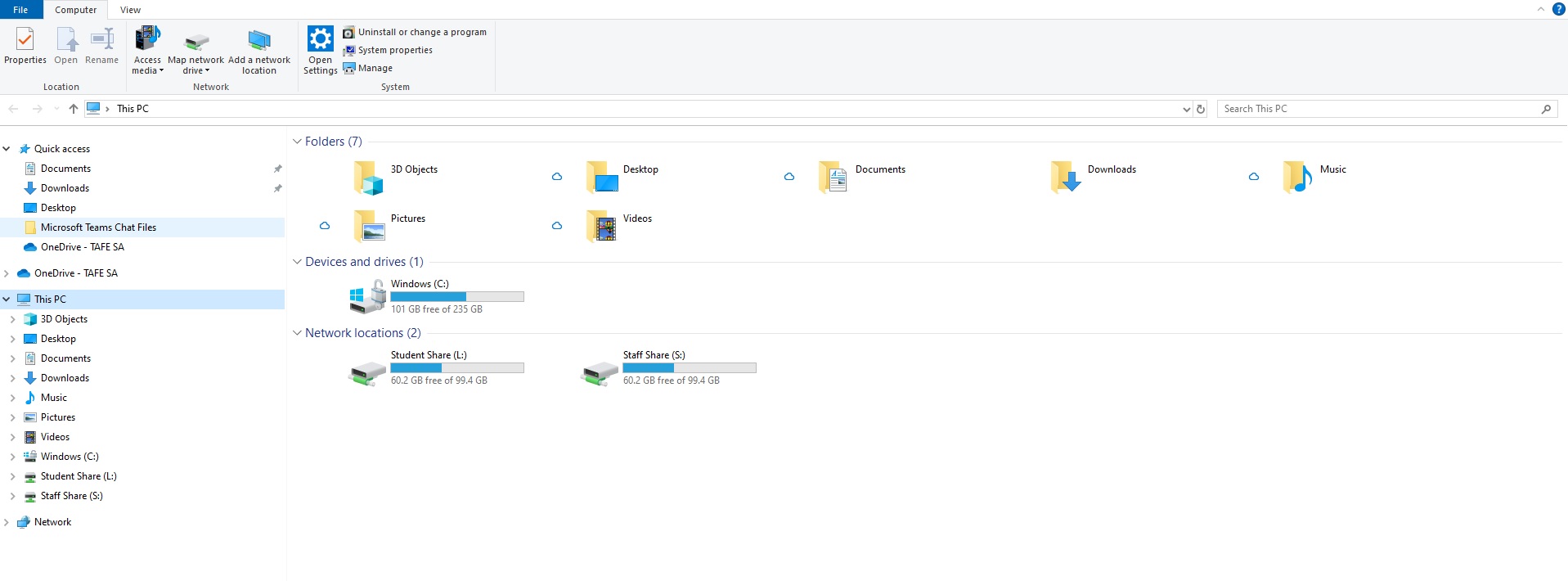 On the left are all the Drives you have access to. Yours may look different if you are looking at your own computer or a TAFE Computer.